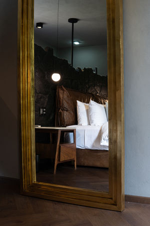En esta habitación, se pueden encontrar elementos de cantera café utilizados en la fachada de esta iglesia, combinando materiales de la época con toques contemporáneos que hacen que la estancia sea placentera.